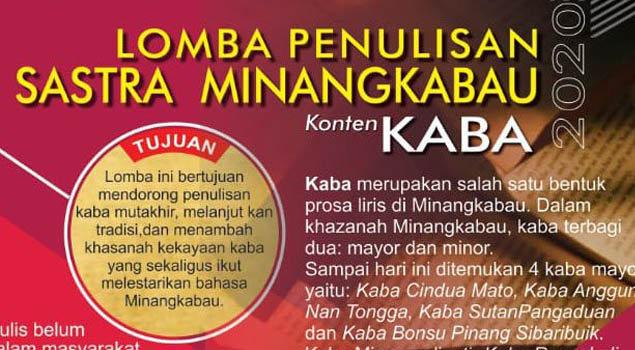 Lomba penulisan satra Minangkabau, konten kaba, digelar Dinas Kebudayaan Provinsi Sumatra Barat (Sumbar). Dibuka sejak Juni lalu, naskah untuk lomba ini masih ditunggu panitia hingga 4 September 2020 nanti. Demikian dilansir siaran pers panitia lomba berhadiah Rp13,5 juta tersebut, Senin (24/8/2020).